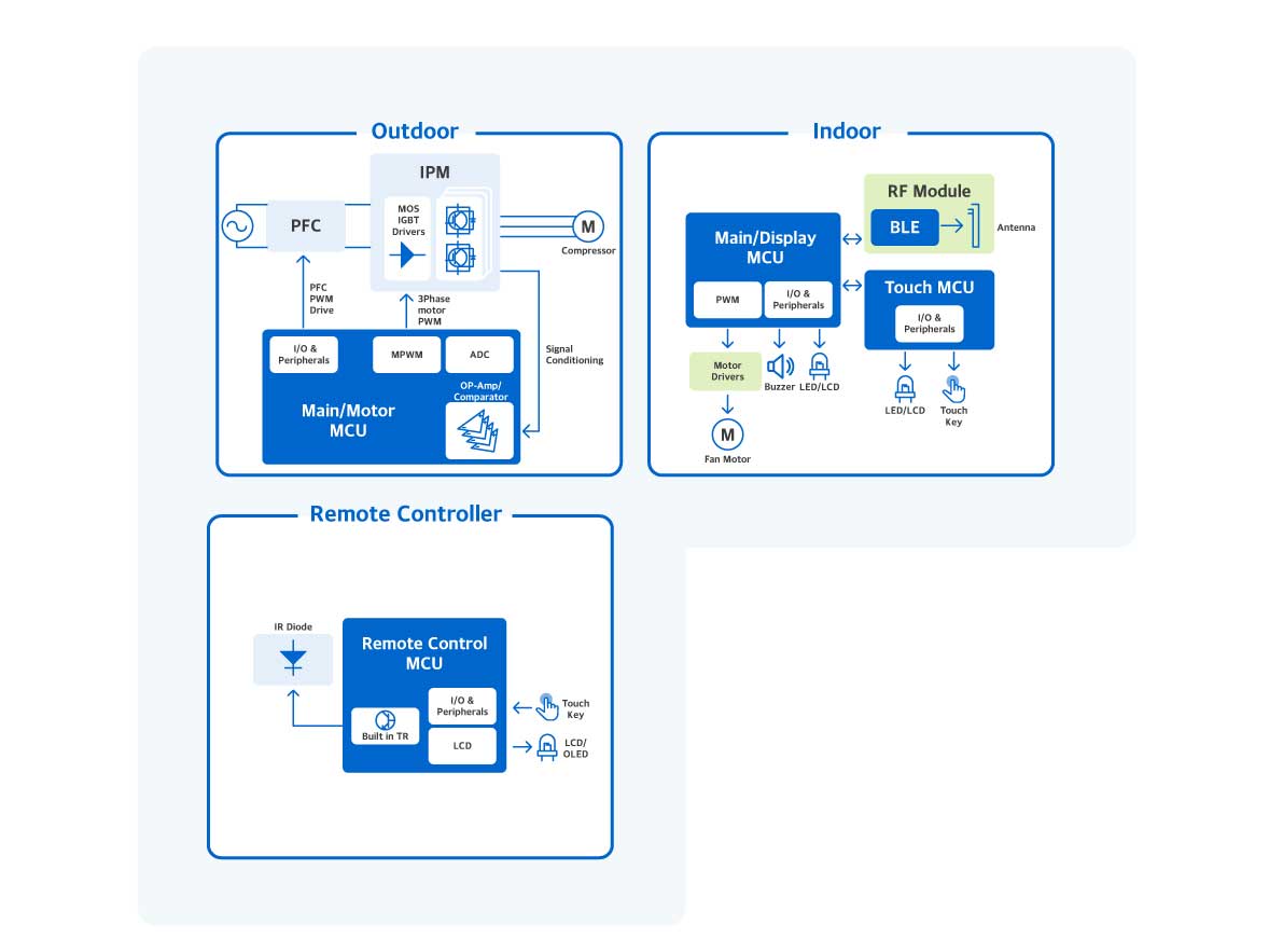 ABOV offers an extensive lineup of MCU products and comprehensive solutions for Air Conditioner Control to realize advanced system controls, improved energy saving technologies, and system cost reduction which is enabled by built-in peripheral functions.