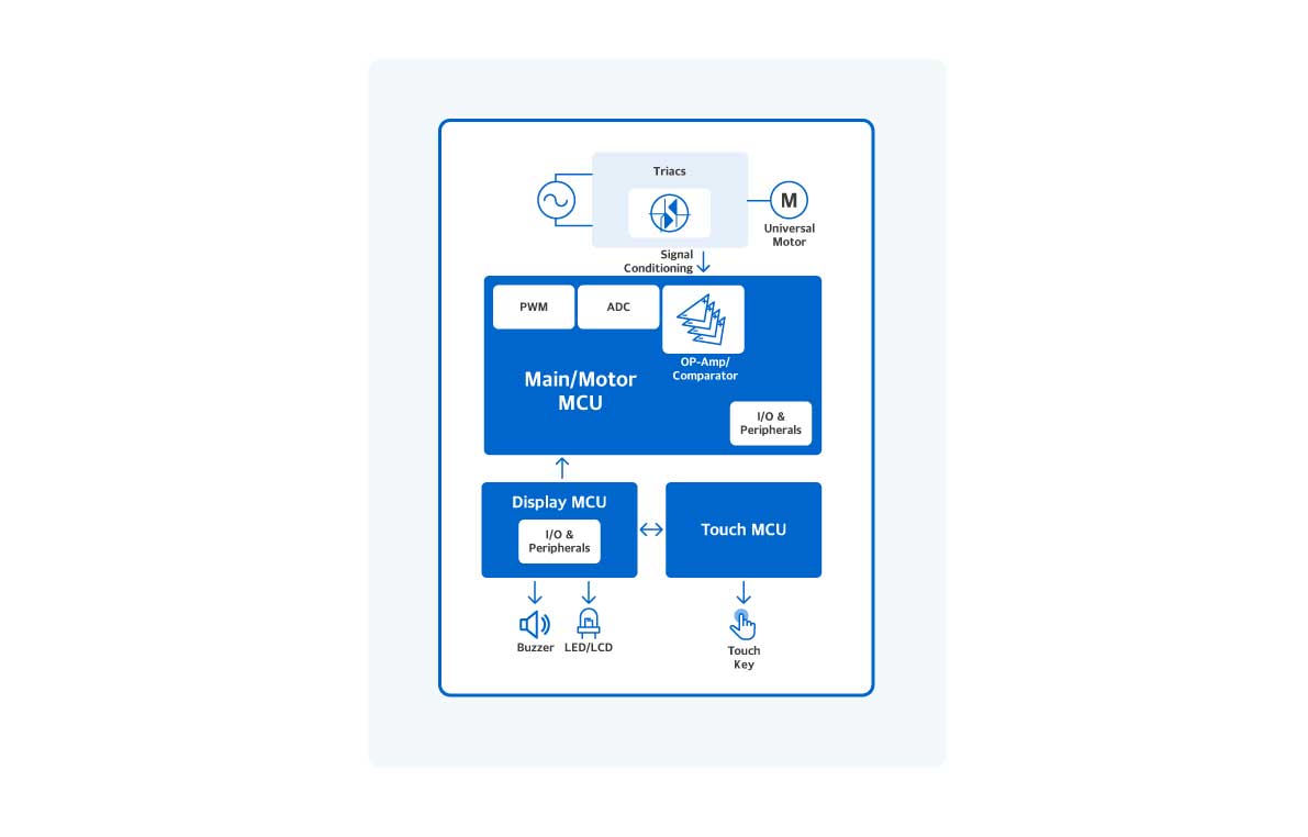 ABOV provides an effective design for Motor/ Main MCUs for Blender. We support interrupts suitable for driving control and a PWM timer for motor control. We improve whipping efficiency to extend the life of a motor too.