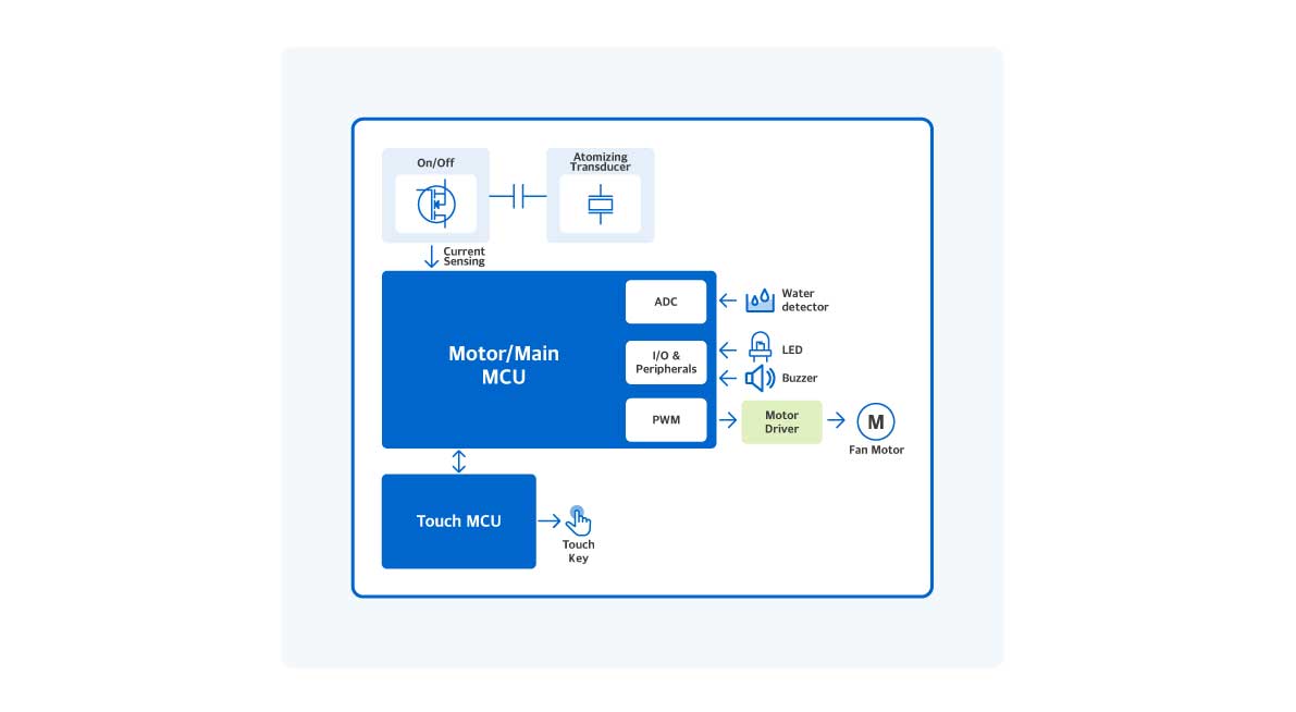ABOV provides Intelligent MCUs for the Humidifier applications. These effectively realize the electricity and energy savings, and can support a variety of Smart Capabilities such as Alarm, Intelligent Switch, and Room Temperature and Humidity Monitoring. Specifically, functions of Water Level Detection and Alarm enhance the safety characteristics of a humidifier.