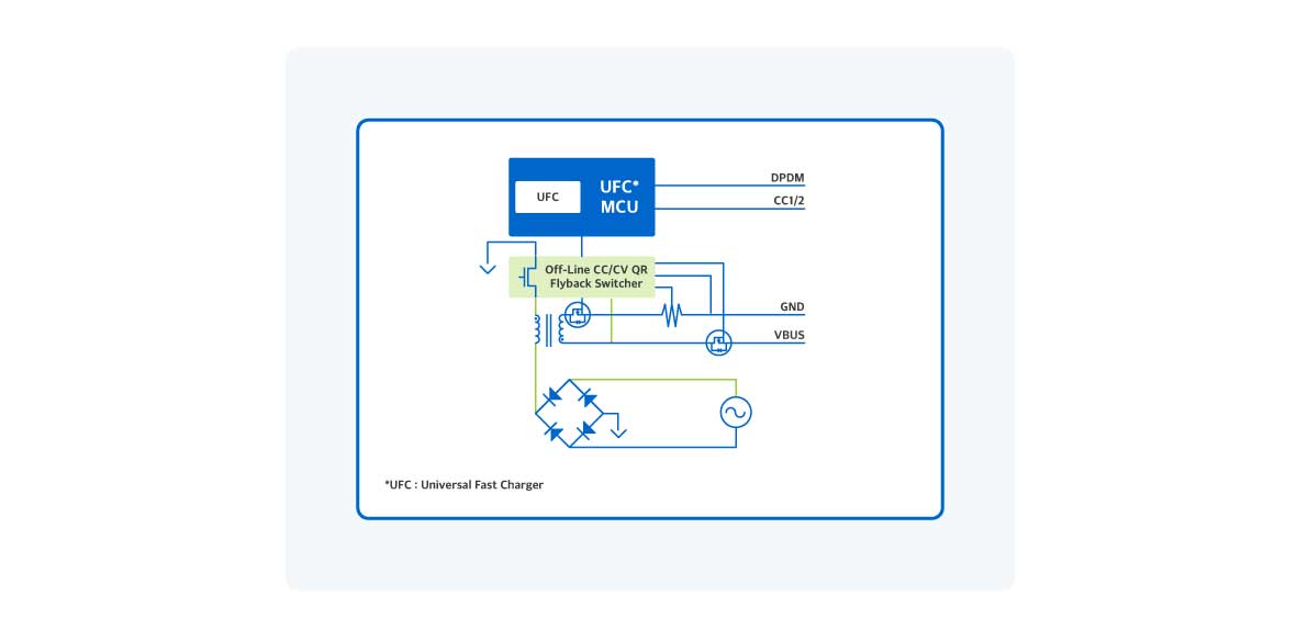 ABOV provides Universal Fast Charger (UFC) MCU for travel adaptors. The UFC MCU is an MCU that supports USB PD3.0 and Legacy high speed charging.