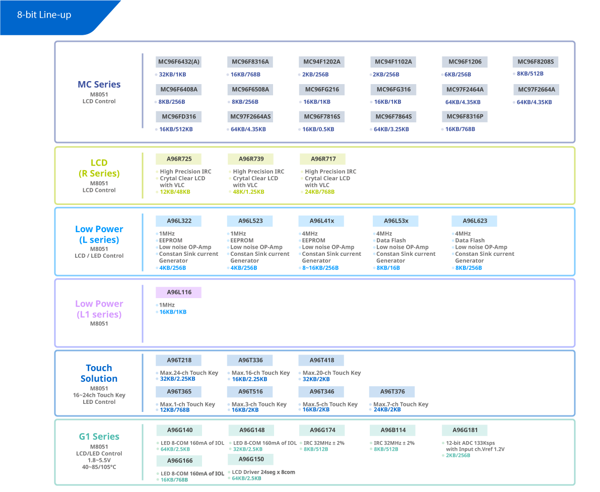 - MC series is an ABOV’s CMOS 8-bit microcontroller. The MC series has high reliability and rich history of mass production, and provides a flash memory ranging in size from 2KB to 128KB. It is highly flexible for using various embedded control applications and supports low power mode to reduce power consumption. As a cost effective solution, it is actively used in the white home appliances, smart home appliances, and consumer markets.