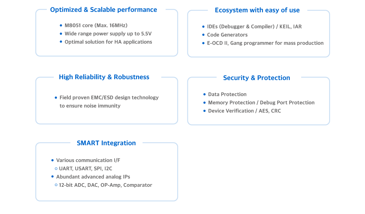 ABOV Semiconductor presents a wide range of 8-bit MCUs that are based on M8051 cores. We have experienced a variety of consumer electronics with them, and based on this, we can provide excellent noise immunity, code optimization, and cost savings for customer’s board design.