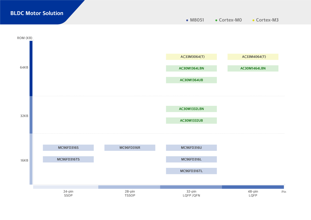▶ AC30M1x64/1x32: Cortex-M0 up to 40MHz / 1-Inverter Control for Fan, Pump, FOC