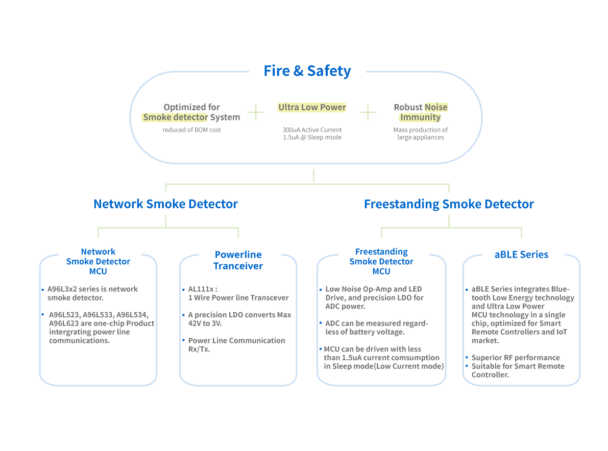 ABOV’s Fire Detection product line provides a total solution for each system, as a stand-alone type or as a network type. This integrates high-precision AFE circuit and line interface for Tx/ Rx, to offer an optimized solution for the Fire Detector System.