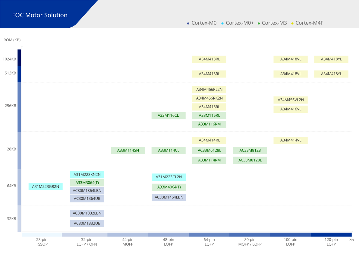 ▶ AC30M1x64/1x32: Cortex-M0 up to 40MHz / 1-Inverter Control for Fan, Pump, FOC