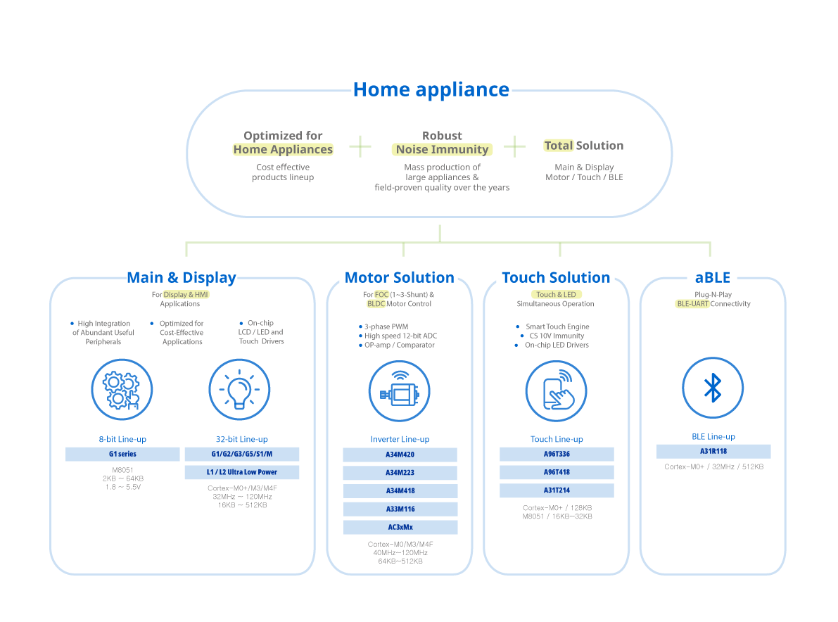 ABOV provides a variety of solutions such as Main Stream & Display, Motor Control, Touch, and Bluetooth for the White Appliances, Kitchen Appliances, and Smart Household Appliances. In addition, we are accelerating the research and development of high-quality, high-efficiency, and high-performance products. We offer a portfolio of 8-bit and 32-bit MCU products to help you design energy-efficient Smart Home Appliances.