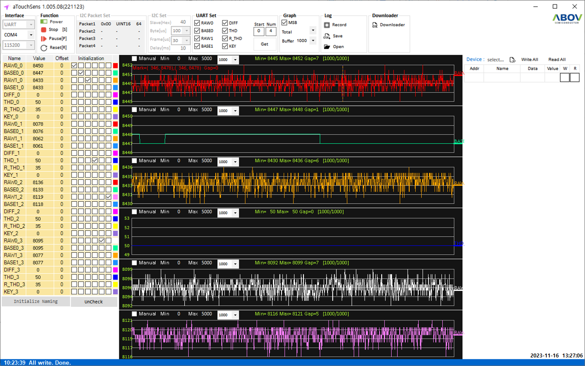 aTouchSens program is a Windows application software that can check the sensing data and operation status of Touch IC. It supports I2C and UART communication and has various built-in functions for a user-friendly development environment.