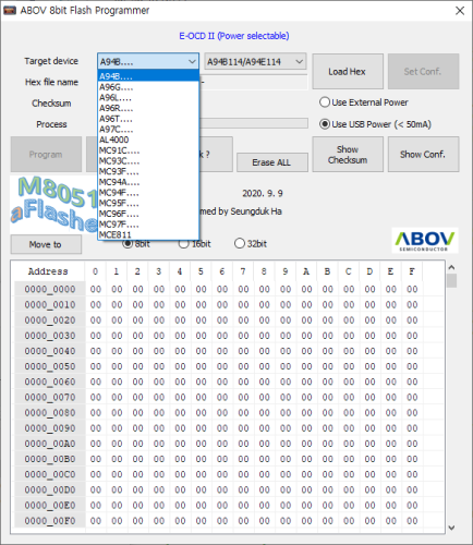 aFlasher8 is an 8-bit Flash Downloader Program for Windows PC. It supports ABOV’s 8-bit microcontrollers via E-OCD II debug interface. The aFlasher8 is a convenient tool that can program a binary hex file into a microcontroller without additional program.