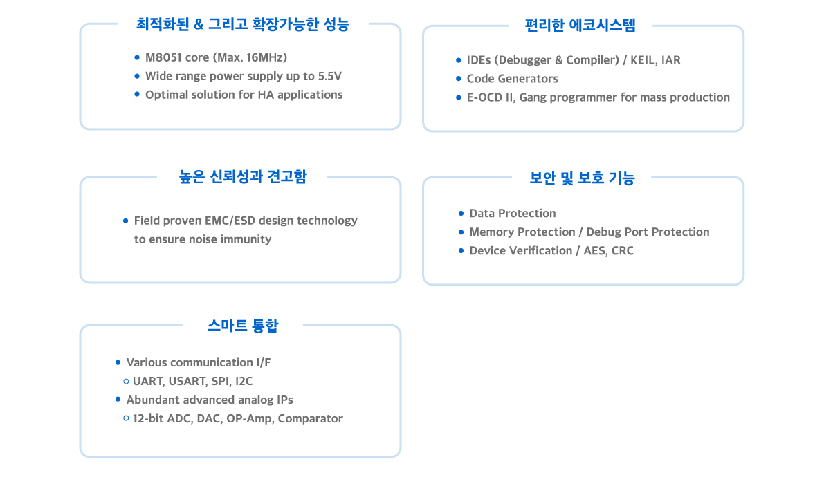 - 본 제품군은 현장에서 검증된 Low Noise OP-Amp, 정밀LDO를 내장하고 있고 4KB~16KB Flash Memory와 별도의 Data Flash를 제공하여 IAP기능이 가능하며, 특히 저전력 구동이 가능합니다.