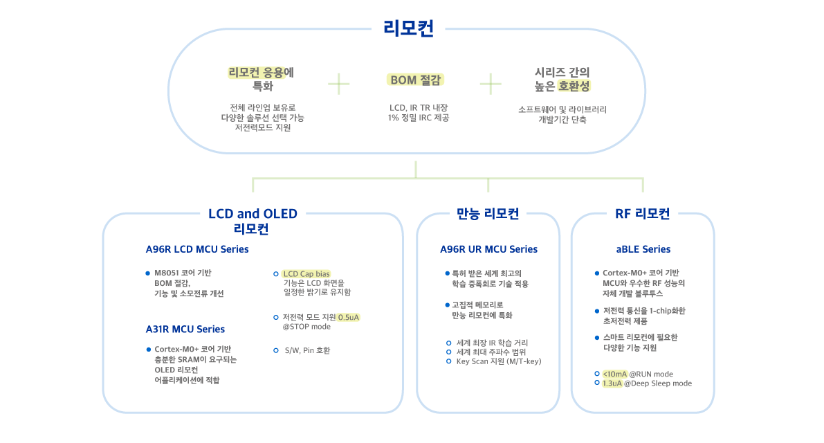 A96R LCD 제품군은 M8051 코어 기반의 차세대 효율적인 마이크로컨트롤러로, BOM 절감, 기능 및 소모전류 측면에서 한 단계 업그레이드된 제품입니다. A31R 제품군은 Cortex-M0+ 코어를 기반으로 풍부한 주변장치를 제공합니다. 특히 충분한 SRAM이 요구되는 OLED 리모컨 어플리케이션에 적합합니다.