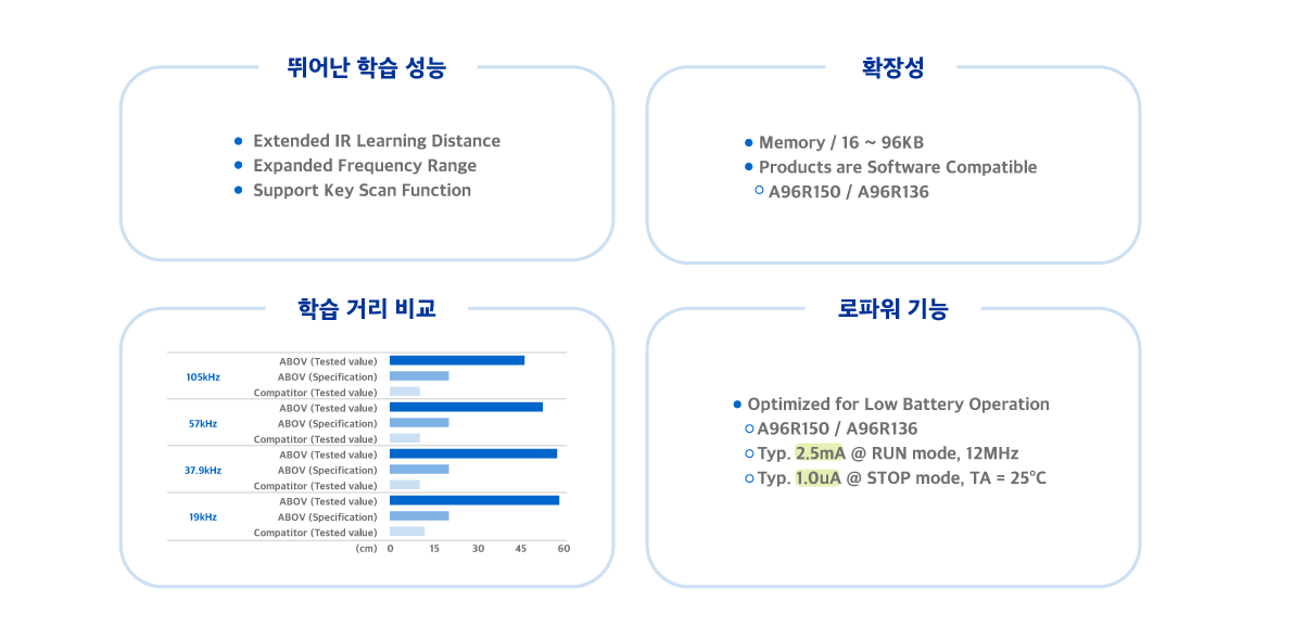 - 어보브반도체의 A96R UR 제품군은 특허 받은 세계 최고 성능의 IR 학습기능(세계 최장 IR 학습 거리, 세계 최대 주파수 범위)이 지원되는 제품으로, 다양한 장치를 제어해야 하는 TV 및 셋톱박스 리모컨 응용인 Universal remote controller 어플리케이션에 최적화 되었습니다.