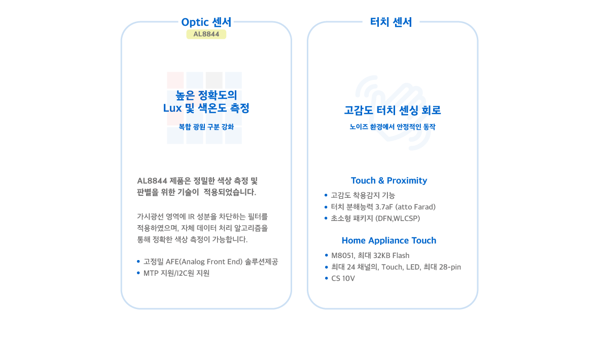 - A96T3/5 터치 센서 시리즈는 고성능 정전용량 터치/근접 센서와 Flash메모리를 탑재한 M8051 제품으로 최대 8 채널과 초소형 패키지(DFN,WLCSP)를 제공합니다. 터치키, 슬라이드, 착용감지와 같은 동작 제어를 위한 토탈 솔루션을 제공합니다.