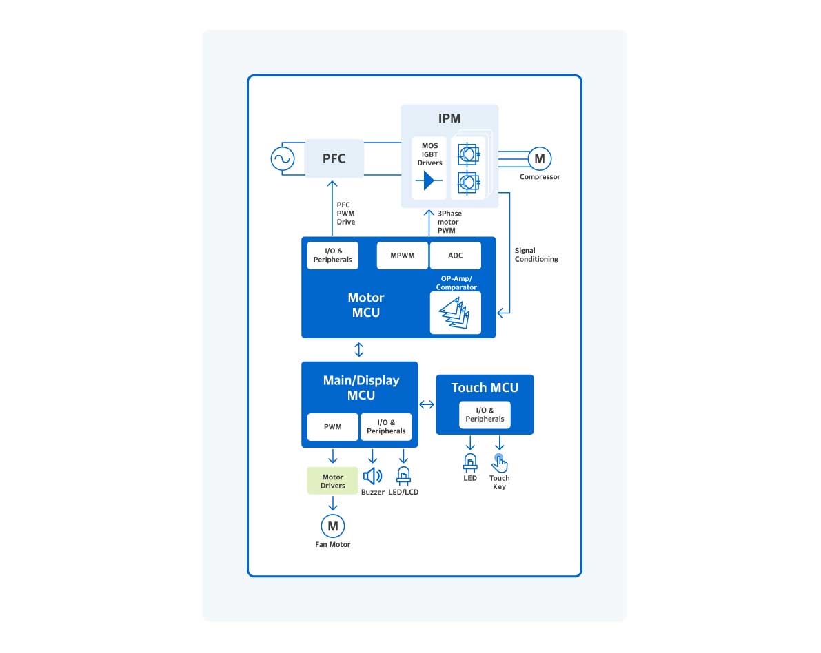 ABOV’s Motor MCU can control one inverter for compressor, and another for Main and display MCUs.
