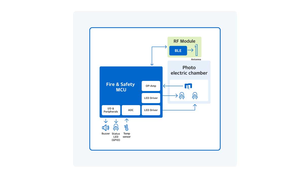 | Fire & Safety Solution | Stand Alone Smoke Detector MCUs | M8051 16KB/8KB Flash Op amp 2-ch, LED Driver 2-ch, Max 3.6V |