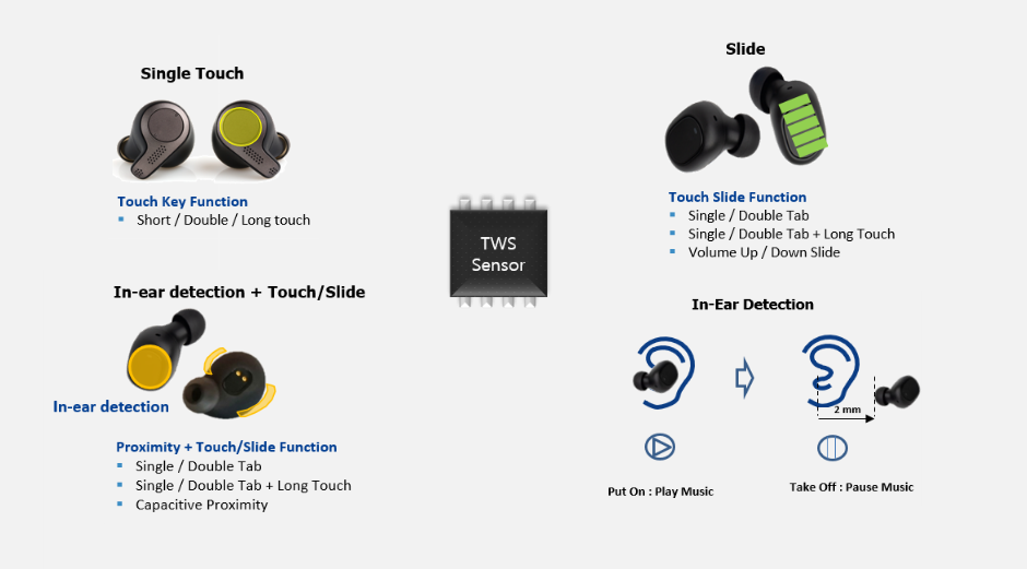 ABOV Semiconductor offers low-power capacitive touch sensors for TWS (True Wireless Stereo) and smart headphones. Integrated with low-power MCU and high-performance analog front-end circuit, ABOV Semiconductor’s touch sensor detects the touch key, slide, proximity, or capacitive force sensing based on the changes of capacitance.